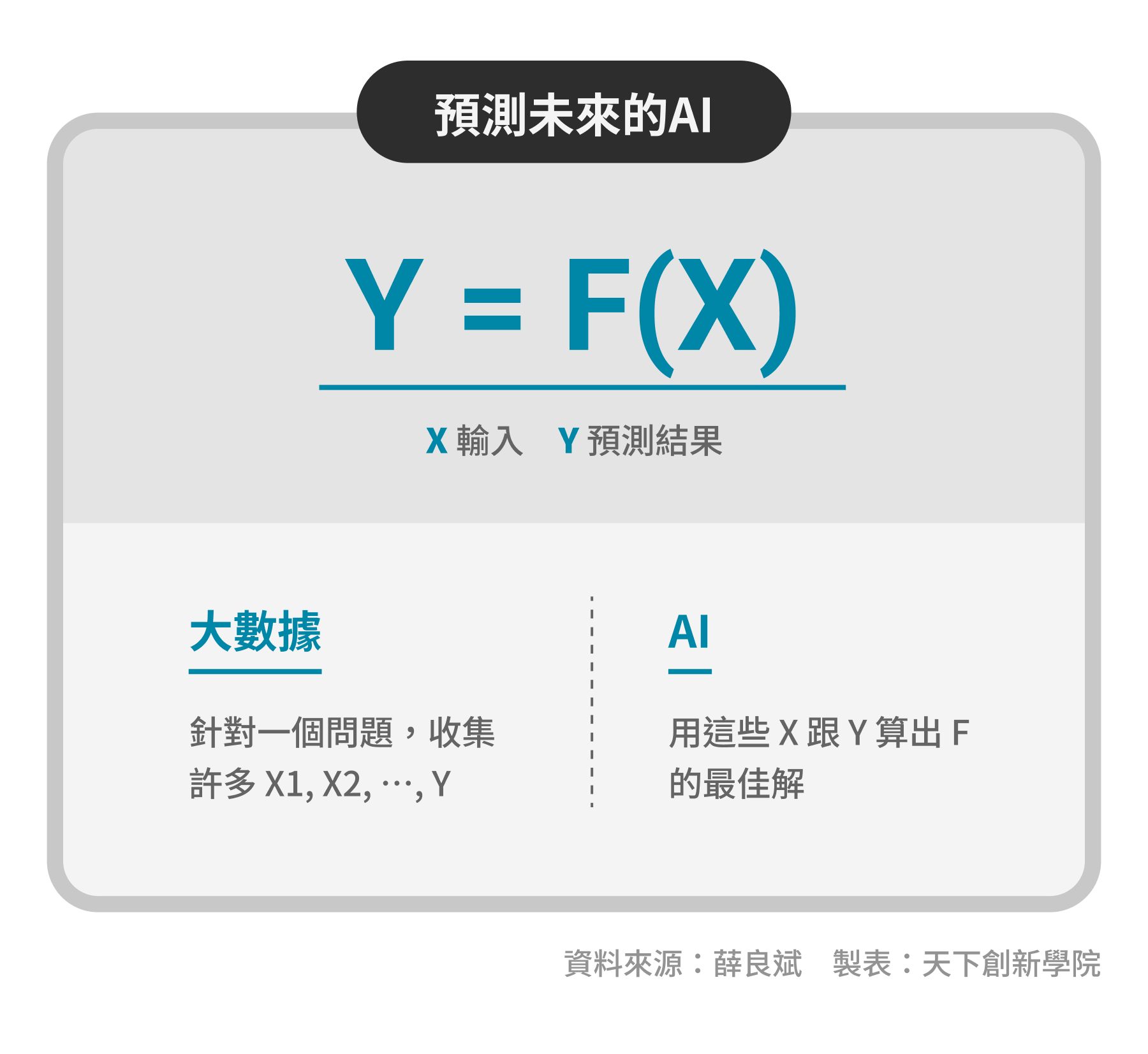 在大家求學階段,一開始遇到數學式的時候,是給你一個已知的F,給你一些X,讓你計算出對應的Y。而我們開發 AI 的目標,則是找到一個最佳的函數F,讓我們能從已知的X預測未知的Y,用已知來預測未來。